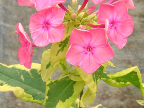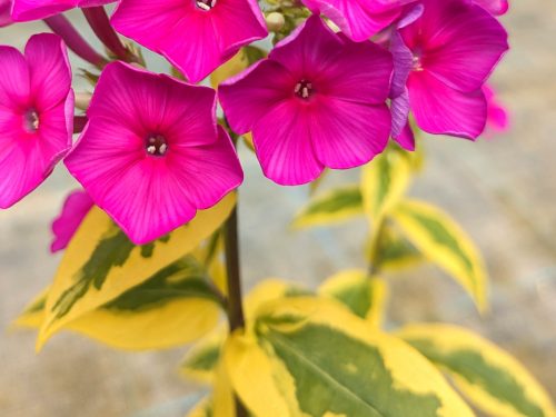 赤紫色のお花に斑入り葉の「ゴールドマイン」